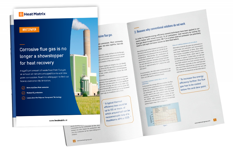 Recovering heat from flue gases is an effective way to lower energy consumption and CO₂ emissions. However, many opportunities go unused due to corrosion risks when cooling below the acid dew point. Heat Matrix polymer heat exchangers offer a robust solution. This whitepaper explains how to recover more heat without corrosion problems, and which technologies are best suited for your situation.